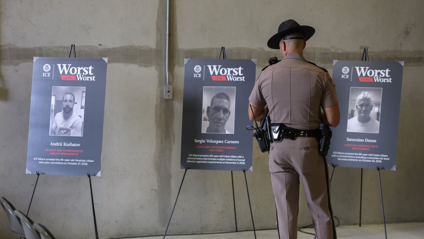 A Florida Highway Patrol officer looks at pictures of undocumented immigrants accused of crimes before a press conference at the ICE Enforcement and Removal Operations building on November 13, 2025 in Miramar, Florida. Florida law enforcement agencies have among the highest ICE cooperation rates in the nation, with state troopers making a significant number of immigration arrests.