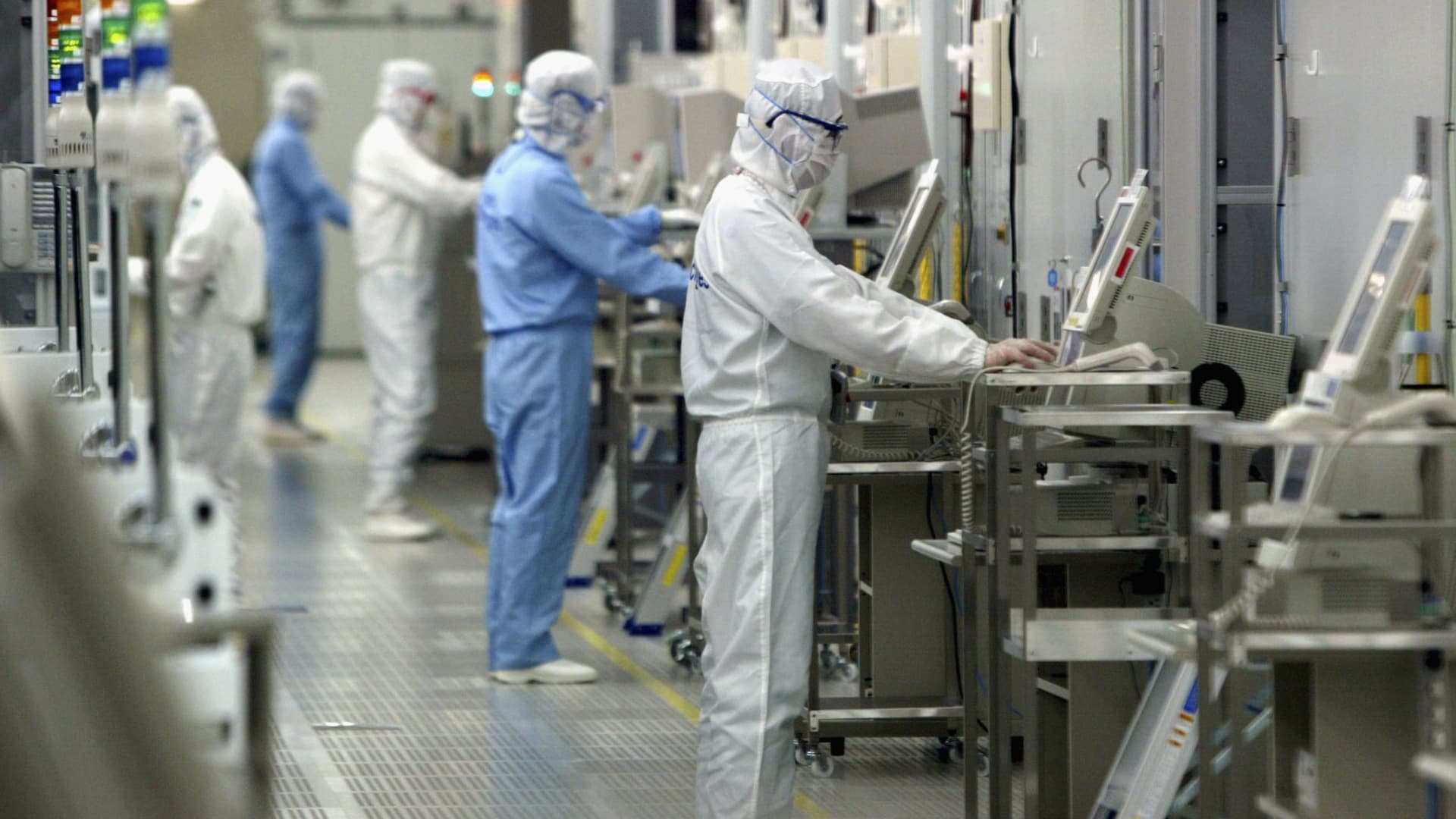 IBARAKI, JAPAN – JUNE 17: Technicians at work in the clean room of the Fab Equipment at a semiconductor company, Renesas Technology Corp. on June 17, 2004 in Ibaraki, Japan. Renesas is the first company to produce semiconductor products from 300mm wafer in the world. (Photo by Koichi Kamoshida/Getty Images)