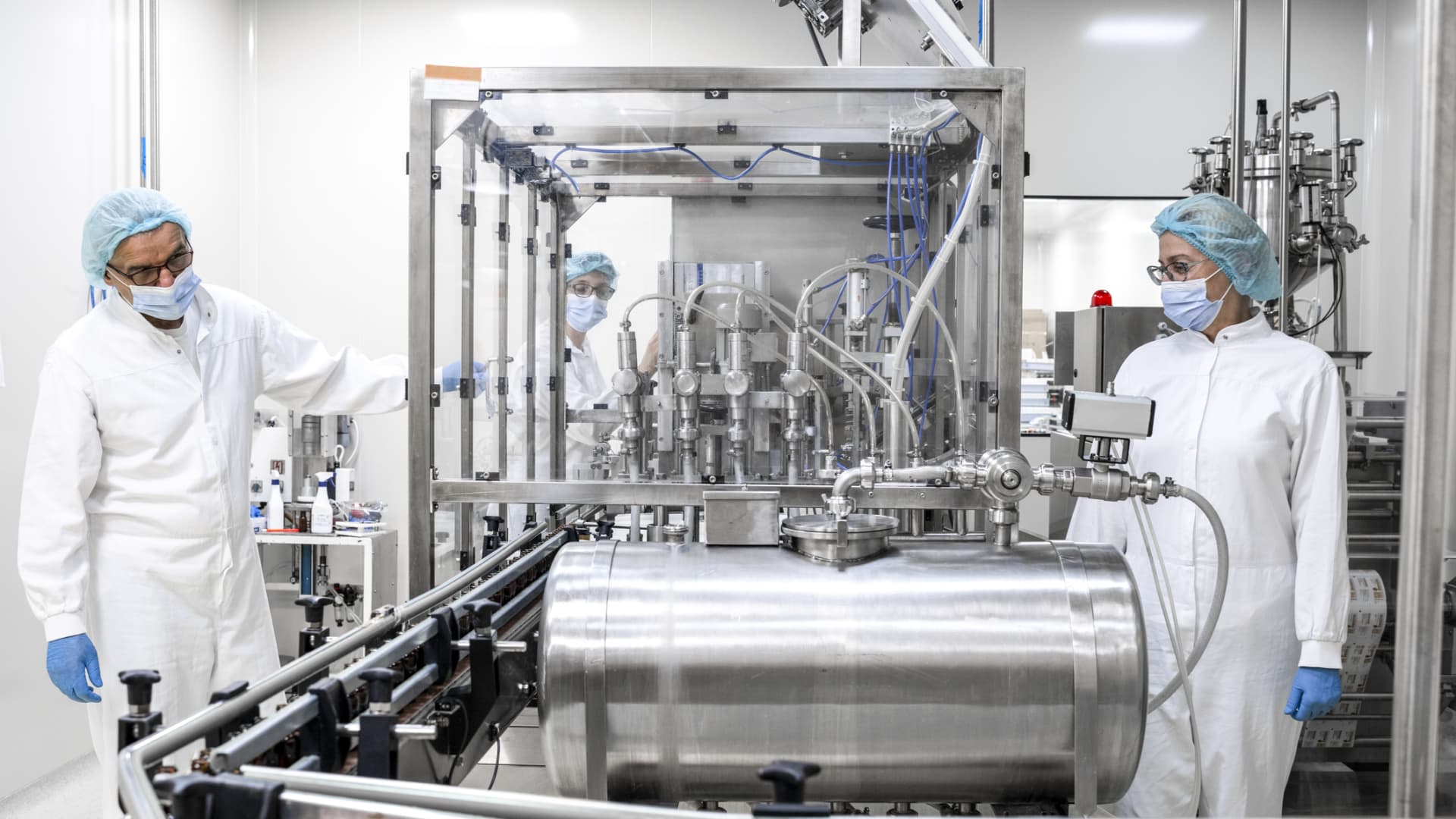 Two employees in pharmaceutical industry wearing protective gloves, mask, cap and white suit seen standing by the machine that is the part of the medicaments production during the working hours in a pharmaceutical manufacturing.