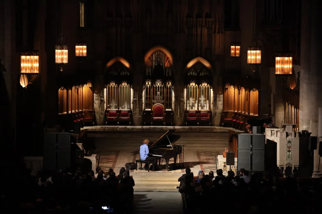 On Tuesday night at Rockefeller Memorial Chapel in Hyde Park, beneath vaulting 80-foot ceilings and organ pipes reaching high over sculpted trumpeters and stone reliefs, Cameron Winter played one of just five shows on a small national tour, a lovely, riveting and very sold-out capper to a remarkable year (New Yorker rave, Atlantic rave, top of Pitchfork’s 2025 lists, “artist of a generation” bombast, et al). He sat on the altar at a piano, without supporting musicians, flanked by ornate carvings and with the audience in pews. He played with his back to the room, for the entire show. You’d play like that too if every other social media hosanna tagged you the next Dylan — cryptic, sardonic, genius. Self-care comes first, folks. He played Carnegie Hall last week in much the same way, while being followed by filmmaker Paul Thomas Anderson and a camera, further recalling the breathlessness that shaped Dylan 60-odd years ago. In fact, depending on where you stand on the Great Winter-Geese Debate, even the guy’s posture — so hunched he seems to be crawling into his Steinway — may be compelling or eye-rolling.