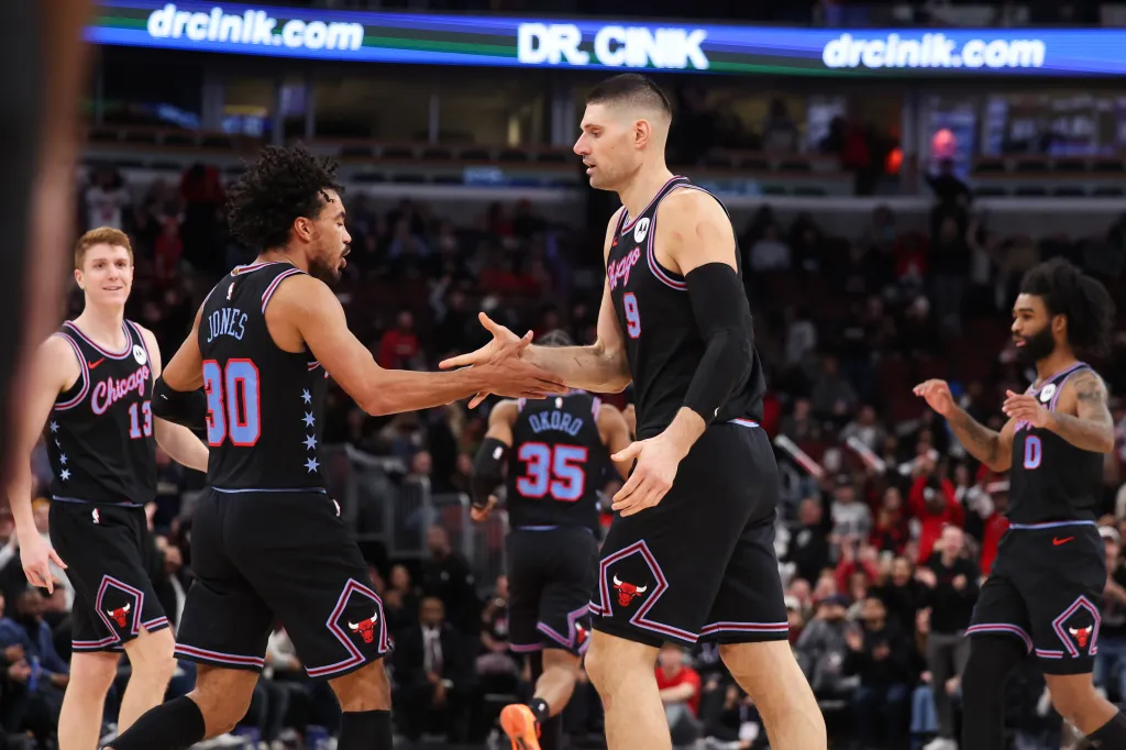 Chicago Bulls center Nikola Vučević smiles after shooting an air ball during the first quarter against the Jazz on Jan. 14, 2026, at the United Center. (Armando L. Sanchez/Chicago Tribune)