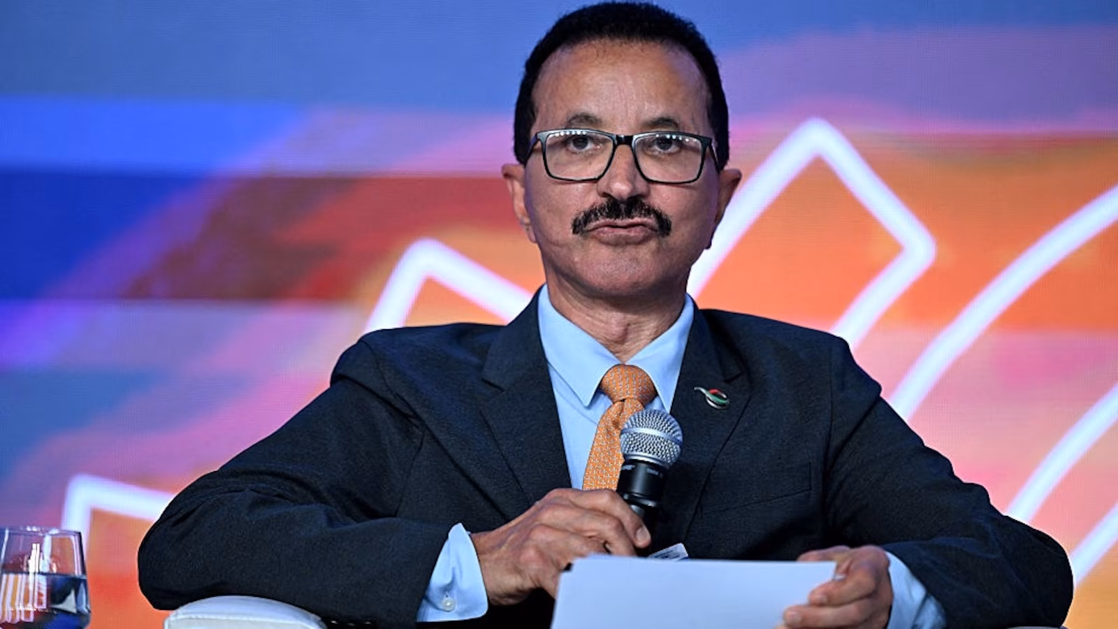 Sultan Ahmed Bin Sulayem, Chairman and Chief Executive Officer of DP World addresses the gathering on the first day of the three-day B20 Summit in New Delhi on August 25, 2023. (Photo by Sajjad HUSSAIN / AFP via Getty Images)
