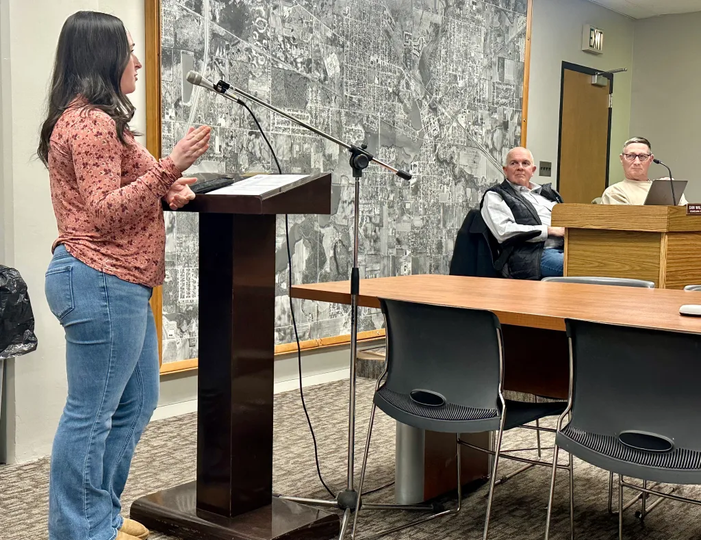 Mayor Josh Huddlestun, on left, speaks during a public hearing on a resolution to declare a 725-acre parcel in Hobart as an Economic Revitalization Area on Wednesday, January 7, 2026. (Kyle Telechan/for the Post-Tribune)