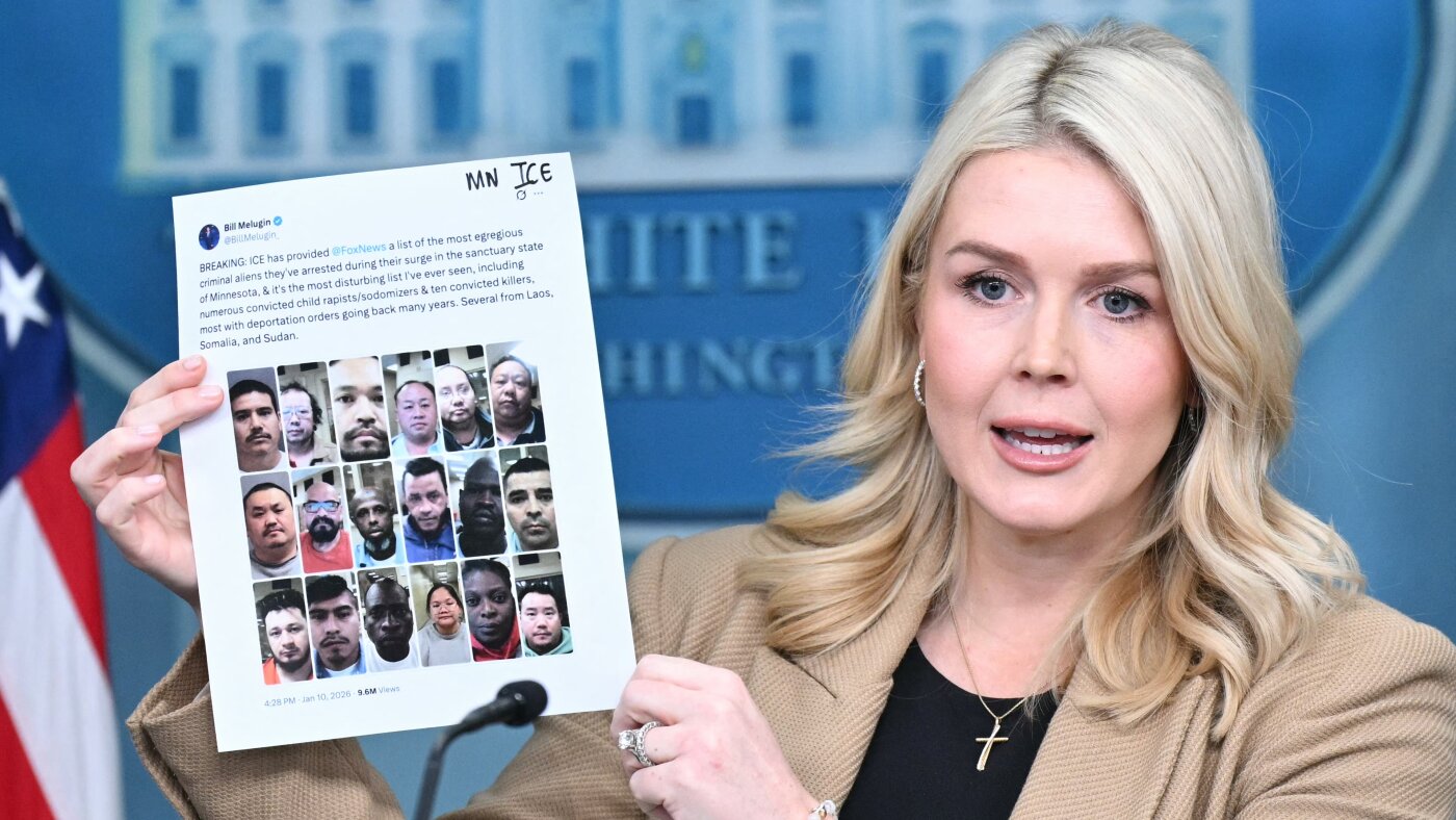 White House Press Secretary Karoline Leavitt holds up a printout of a social media post with pictures of alleged undocumented criminals arrested recently by Immigration and Customs Enforcement (ICE) in Minnesota as she speaks during a press briefing at the White House on Jan. 15, 2026.