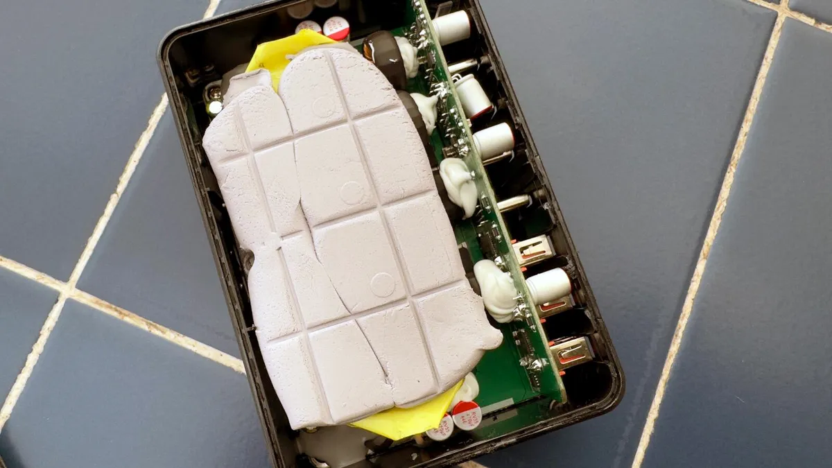 The first thing that greeted me was a lump of… something. At first glance, it looked like a thermal compound, but it smelled and felt more like a window glazing compound, leaving behind an oily residue. It was also surprisingly heavy, almost as if it had been added to give the charger some artificial heft. Without it, the remains of the charger felt incredibly light.
