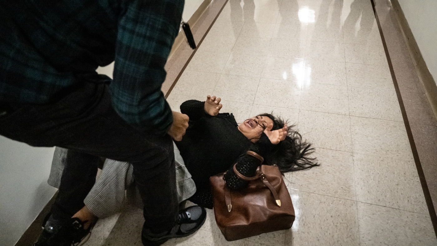 A federal agent pushes the wife of the detained man from Ecuador to the ground on September 25, 2025 in New York City.