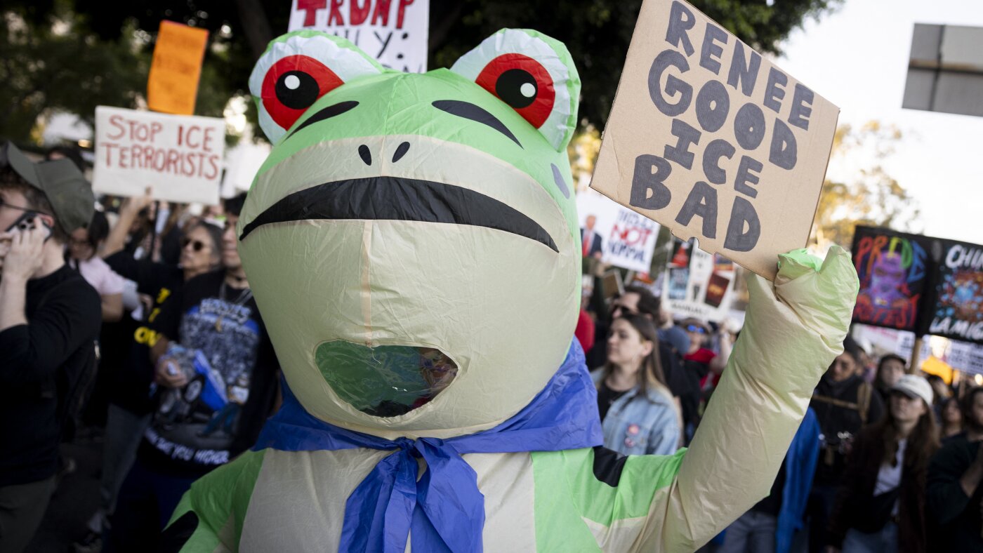 A person in an inflatable frog suit holds a sign during a protest in Los Angeles on Jan.10 against US Immigration and Customs Enforcement (ICE) after the fatal shooting of Renee Nicole Good in Minneapolis.