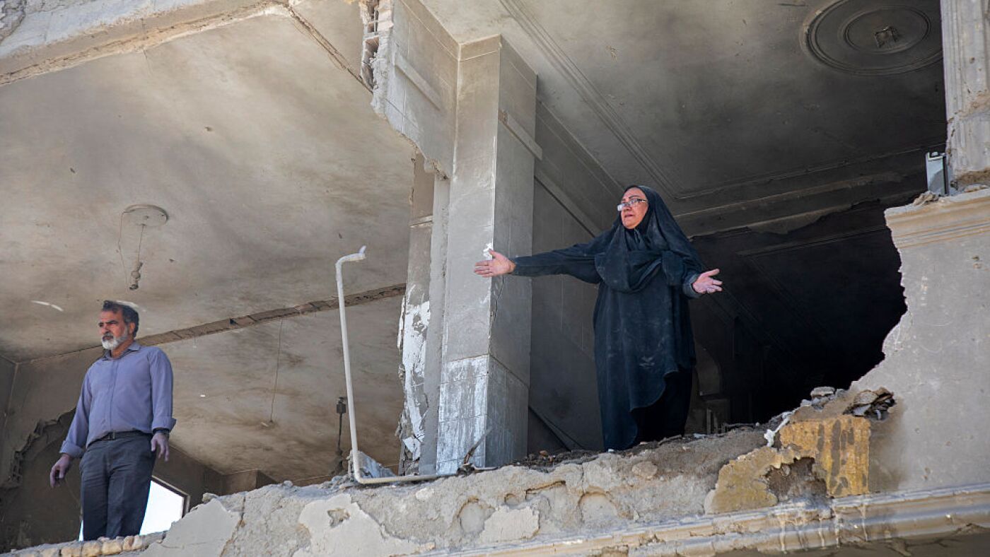 A resident gestures from an upper floor of a ruined residential building that was hit in an airstrike earlier this morning on March 30, 2026 in the west of Tehran, Iran.