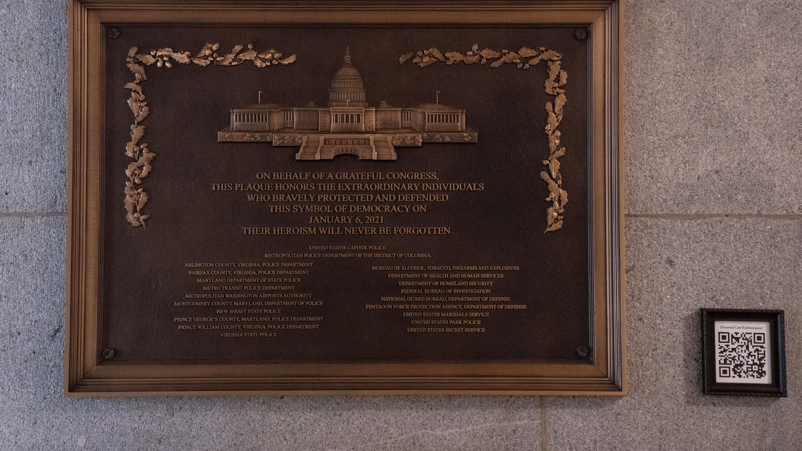 “On behalf of a grateful Congress, this plaque honors the extraordinary individuals who bravely protected and defended this symbol of democracy on January 6, 2021,” the plaque says. “Their heroism will never be forgotten.”