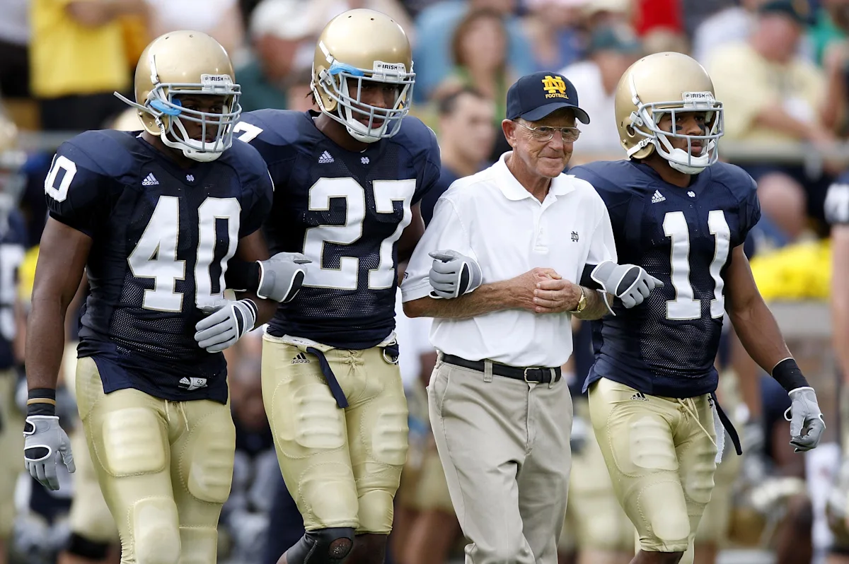 SOUTH BEND, IN – SEPTEMBER 13: Former head coach Lou Holtz of the Notre Dame Fighting Irish walks out for the coin toss with David Grimes #11, David Bruton #27 and Maurice Crum #40 prior to playing the Michigan Wolverines on September 13, 2008 at Notre Dame Stadium in South Bend, Indiana. (Photo by Gregory Shamus/Getty Images)