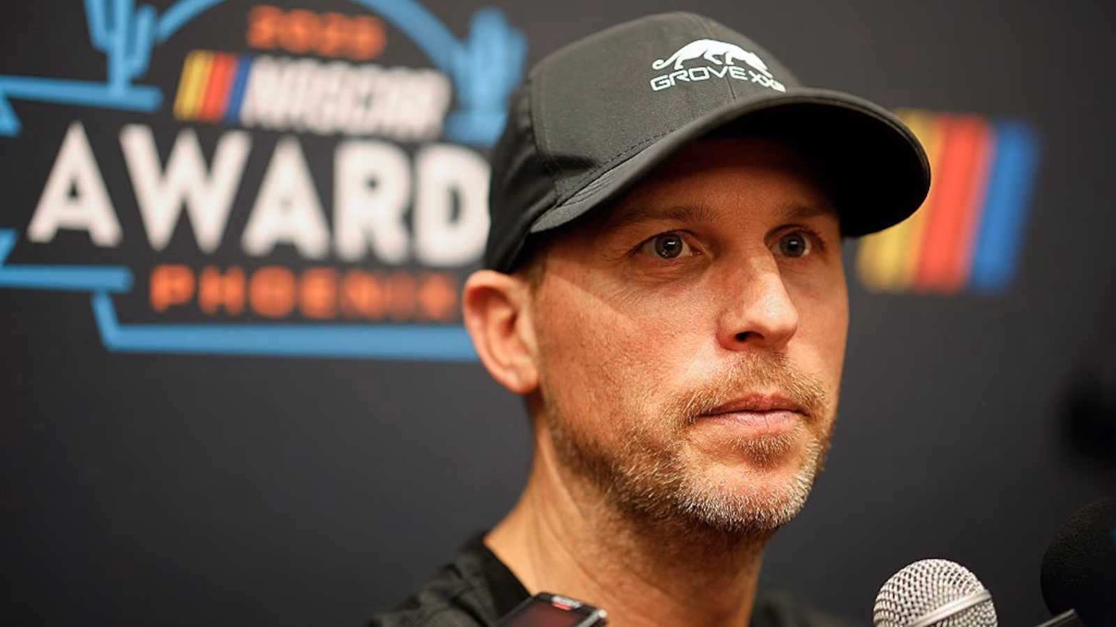 PHOENIX, ARIZONA – NOVEMBER 04: NASCAR Cup Series driver, Denny Hamlin speaks to the media during NASCAR Champions week at JW Marriott Desert Ridge Resort & Spa on November 04, 2025 in Phoenix, Arizona. (Photo by Sean Gardner/Getty Images)