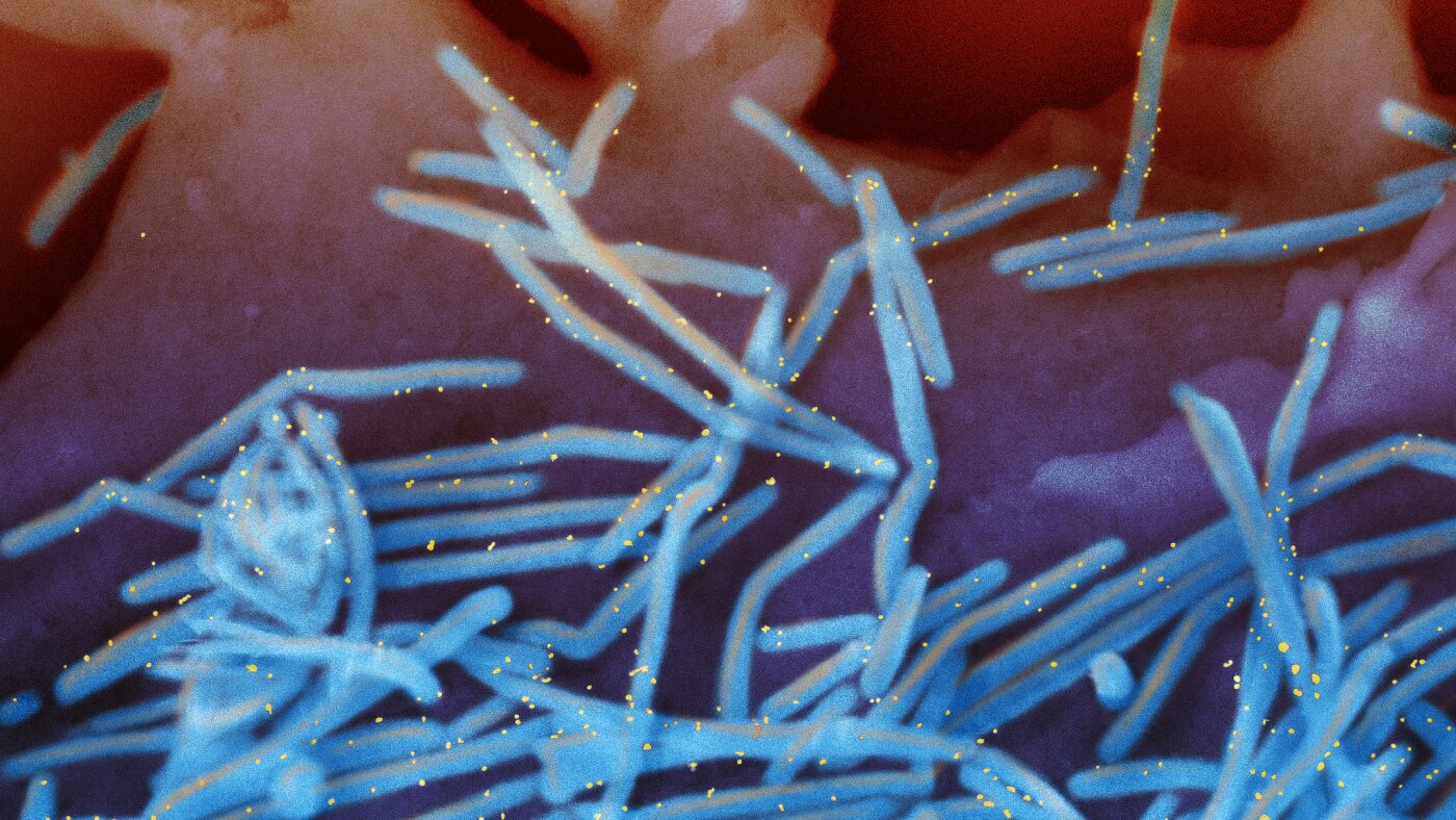 An electron microscope image provided by the National Institutes of Health shows human respiratory syncytial virus virions, colorized blue, and antibodies against an RSV protein, colorized yellow.