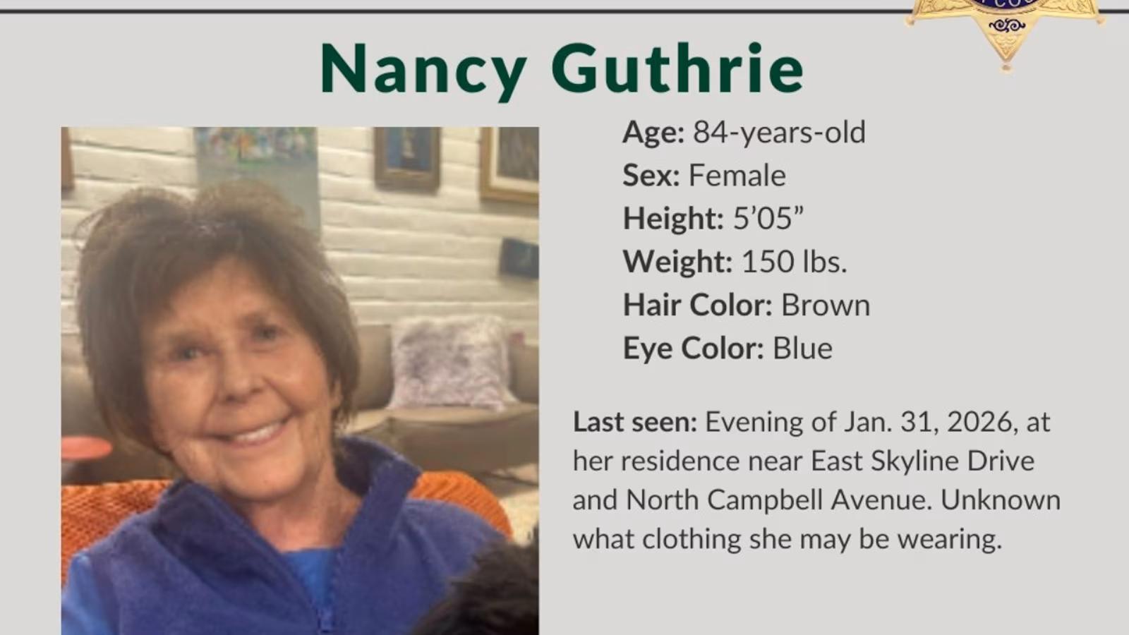 Nancy Guthrie was last seen in the Catalina Foothills area on Saturday night, according to the Pima County Sheriff’s Department. Her family reported her missing on Sunday around noon local time, authorities said.