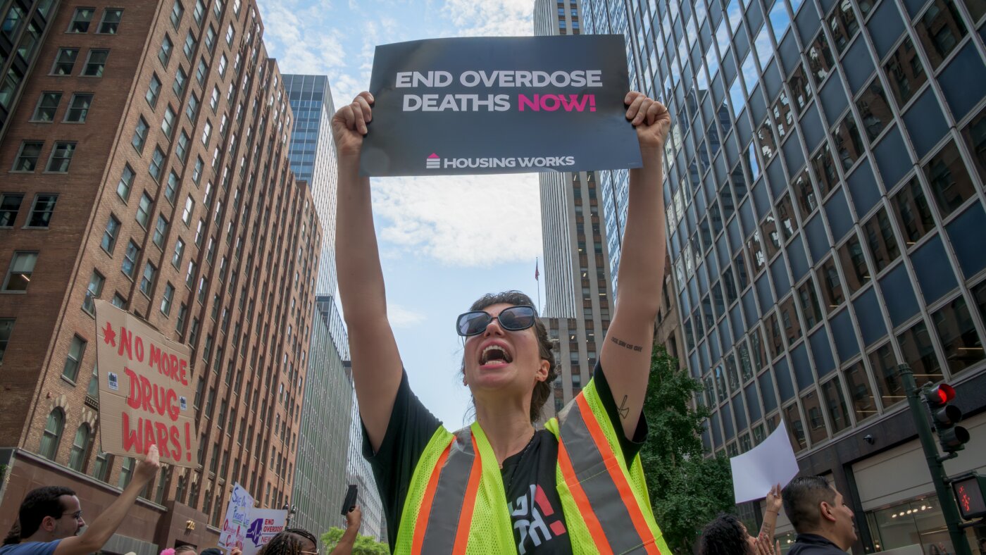A demonstrator holds a sign during International Overdose Awareness Day on Aug. 28, 2024 in New York City.