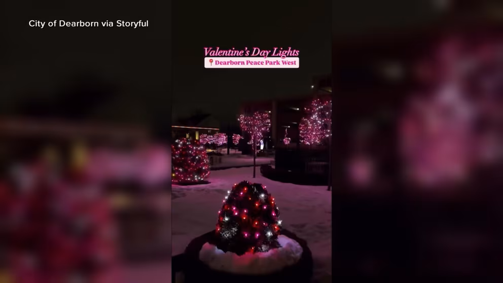 Dearborn Peace Park West is decorated with Valentine’s Day-themed lights and displays.