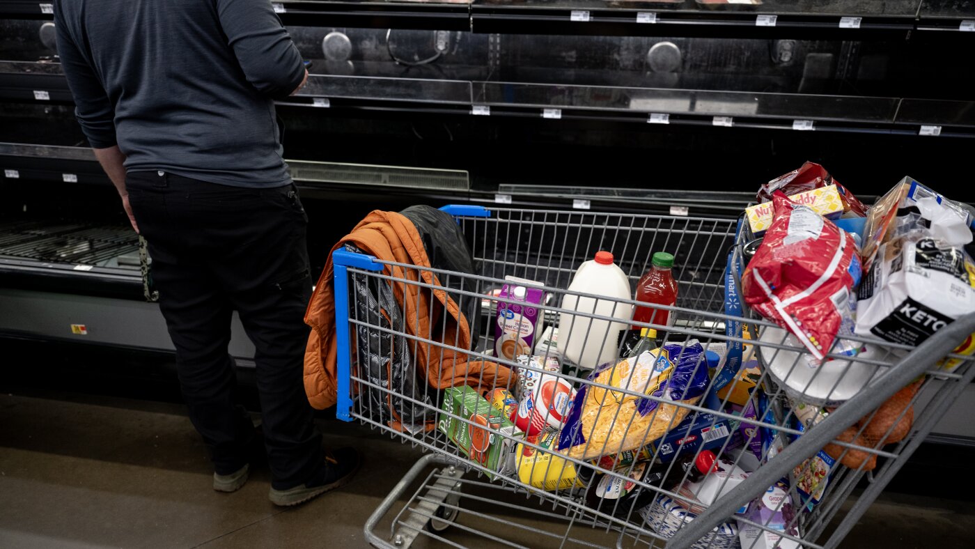 A shopper searches for water on near-empty shelves in a grocery store ahead of winter weather, Wednesday, in Marietta, Ga.